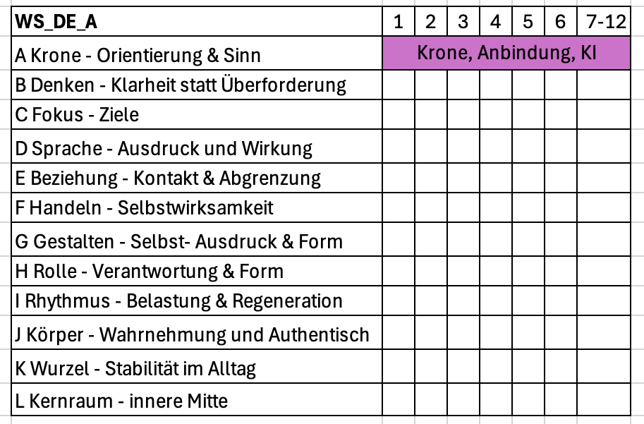 Horizontale Stufenlogik A1–A12 • Stufe 1–3: Wahrnehmen von Ordnung, Sinnfragen, übergeordneten Bezügen → „Da ist mehr als mein aktuelles Thema“ • Stufe 4–6: Klärung von Haltung, innerem Kompass, tragenden Werte → Sinn wird verortbar, nicht interpretiert • Stufe 7–9: Stabilisierung der Ausrichtung unter Belastung → Orientierung bleibt auch bei Krise, Druck, Wandel • Stufe 10–12: Integration in Wirken, Verantwortung, Systembezug → Sinn wird tragfähig, nicht abstrakt