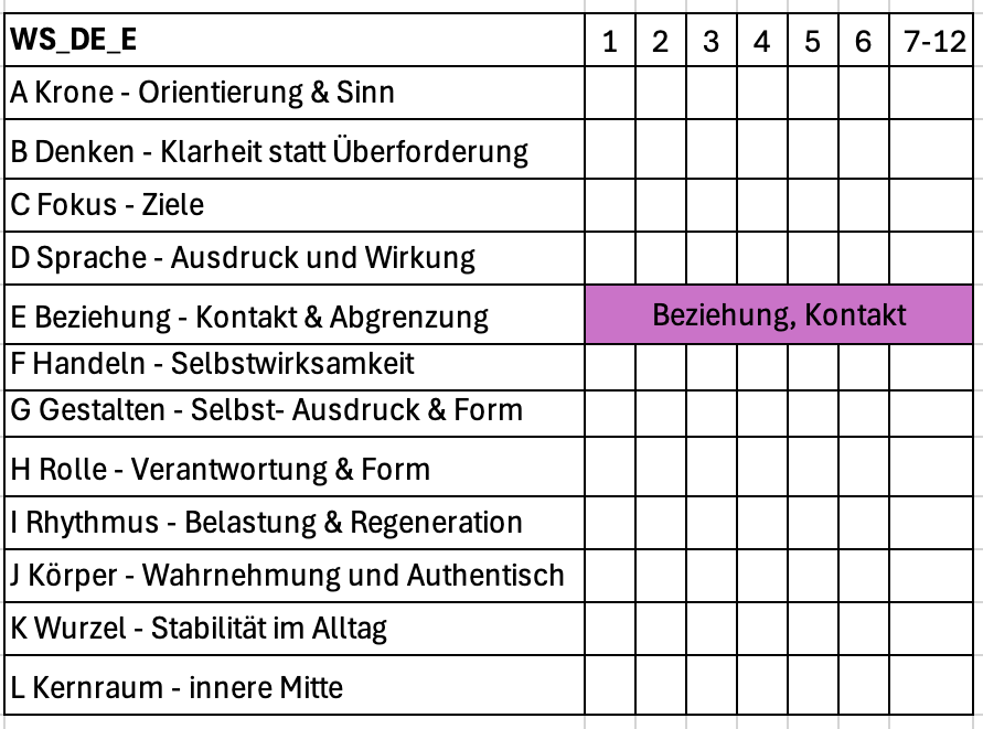 Dieser Kurs – Äquilibrium Salus (AES) Thema E Beziehung & Kontakt über 12 Stufen: Beziehungsraum detailliert reflektieren. Nutzenfokus (emotional & funktional) • Mehr innere Sicherheit im Kontakt mit anderen • Klarheit über Nähe, Distanz und eigene Grenzen • Entlastung von Beziehungsdruck, Missverständnissen und Rollenverstrickung Für wen geeignet • Menschen mit wiederkehrenden Beziehungskonflikten • Personen, die sich stark anpassen oder schwer abgrenzen • Alle, die Beziehung bewusster und stimmiger gestalten möchten