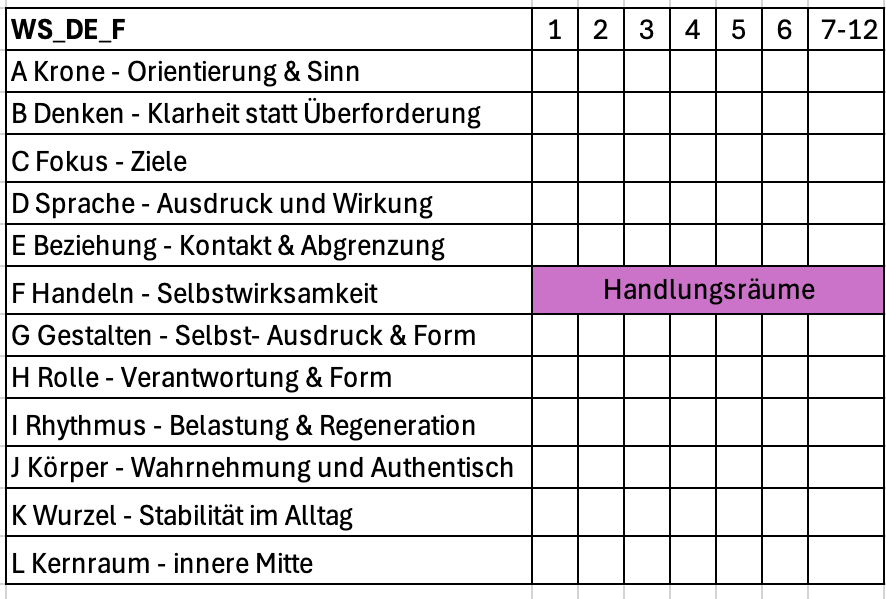 Dieser Kurs basiert auf dem McQuirey-Atlas, einem mehrdimensionalen Orientierungsmodell zur Beschreibung menschlicher Wahrnehmung, Haltung und Handlung. Der McQuirey-Atlas bildet ein umfassendes Gesamtgefüge. Dieser Workshop stellt daraus eine klar abgegrenzte Ebene dar: das Thema Handeln (F) mit all seinen unterschiedlichen Qualitäten um stimmiges Handeln zu erreichen. Hier werden in 12 Stufen auf eigene Inhaltliche Umsetzung & Aktualität neu geordnet und integriert. Auf Basis von Resonanzfelder steht die horizontale Betrachtung eines Themenfeldes auf 12 aufeinander aufbauenden Feldern und deren Übergänge im Mittelpunkt des Workshops . Ziel ist nicht Analyse oder Veränderung, sondern das Einbringen eigener Themen und Anwendung.