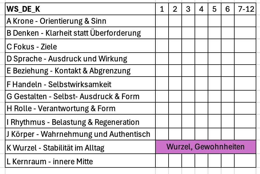 Grundlage – Stabilität – tragende Ordnung Die Wurzel beschreibt, wie tragfähig ein Mensch im Leben steht – körperlich, emotional, existenziell. Die Stufen 1–12 zeigen den Weg von unbewusster Grundspannung hin zu verlässlicher innerer und äußerer Standfestigkeit, auch unter Belastung.