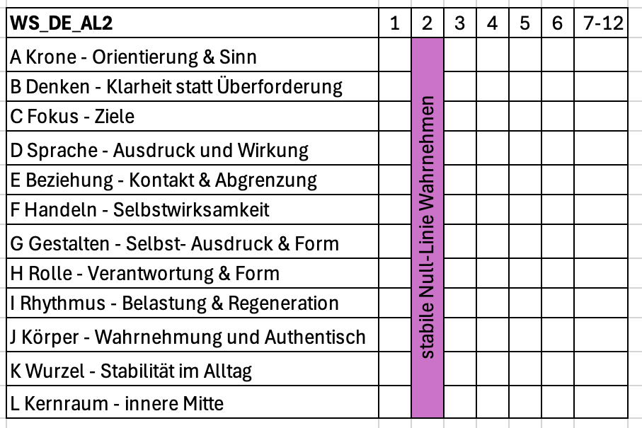 Dieser Kurs basiert auf dem McQuirey-Atlas, einem mehrdimensionalen Orientierungsmodell zur Beschreibung menschlicher Wahrnehmung, Haltung und Handlung. Der McQuirey-Atlas bildet ein umfassendes Gesamtgefüge. Dieser Workshop stellt daraus eine klar abgegrenzte Ebene dar: die Wahrnehmung der sogenannten Null-Linie auf Stufe 2 – als neutralen Ausgangspunkt vor Bewertung, Reaktion oder Entscheidung. Im Fokus steht die vertikale Betrachtung aller zwölf Themenfelder (A–L) ausschließlich auf dieser Wahrnehmungsebene. Ziel ist nicht Analyse oder Veränderung, sondern ein differenziertes Erkennen innerer Prozesse im Zusammenhang des Ganzen.